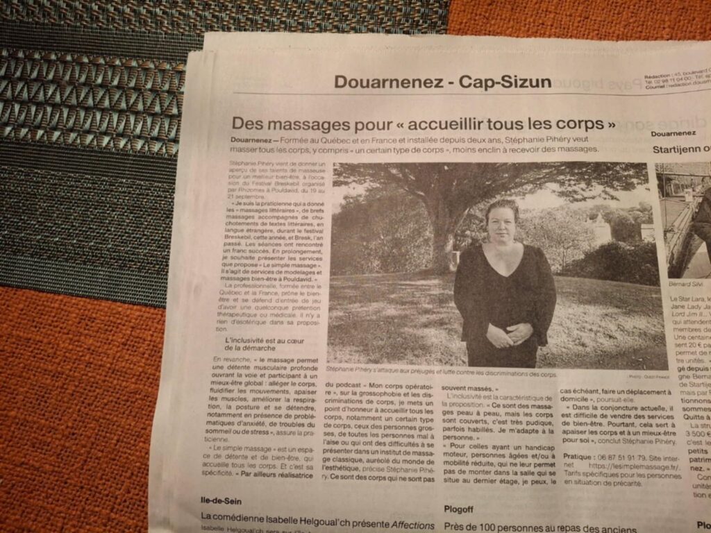 “Je suis la praticienne qui a donné. Les massages littéraires. De brefs massages accompagnés de chuchotements de textes littéraires en langues étrangères durant le festival Breskebil cette année et Bresk! l’an passé. Les séances ont rencontré un franc succès. En prolongement, je souhaite présenter les services que propose le simple massage. Il s’agit de services de modelages, de massages bien-être à Pouldavid.”*
